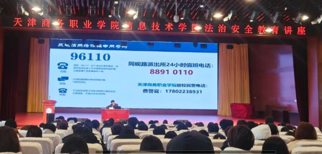 为加强平安校园建设,进一步提升学生法治素养和安全意识,2025年3月18日,信息技术学院联合学校党委安全工作部邀请天津市公安局津南分局同砚路派出所驻校民警开展法治安全教育讲座。信息技术学院辅导员及在校生代表共计400余人参加了此次活动。